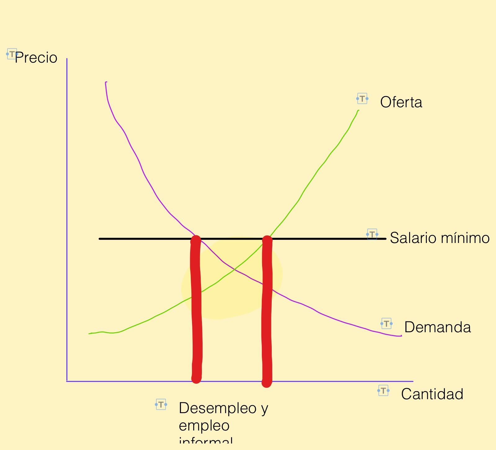 Veamos que el eje horizontal muestra la cantidad de trabajo, el eje vertical muestra el salario y la línea punteada verde representa el salario mínimo. El espacio entre las líneas rojas marca las áreas en las que se causa desempleo y empleo informal. Son las personas que necesitan trabajar, pero sus capacidades no permiten que puedan obtenerlo por encima del salario mínimo «autorizado».