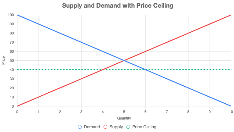 Esta gráfica, creada por Grok para que no digan, claramente muestra el efecto. La línea azul es la demanda y la línea roja, la oferta. La línea punteada verde es el precio máximo. Ese precio máximo reduce la oferta de esos (4 unidades) y aumenta la demanda natural de dichos bienes (de 5 a 6 unidades). El equilibrio se rompe y existe la escasez, pues ahora faltan 2 unidades para el equilibrio.